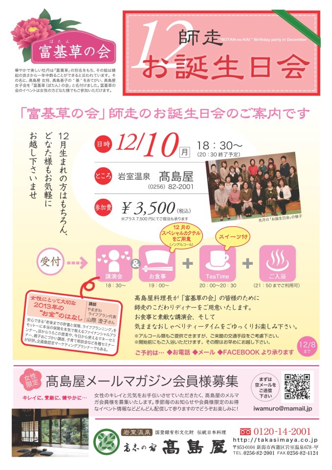 岩室温泉「高島屋旅館」の女子会でセミナーします どなたでも気軽に参加できます